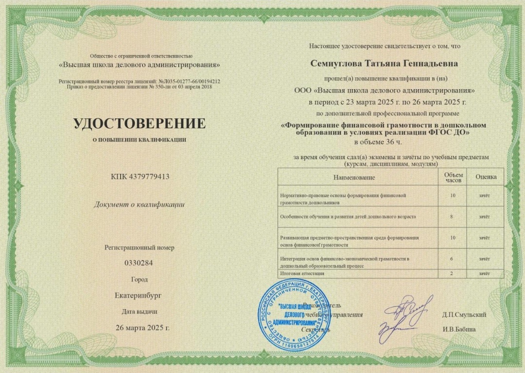 (ООО «Высшая школа делового администрирования». г. Екатеринбург . 36часов. Форма обучения: дистанционная.).
