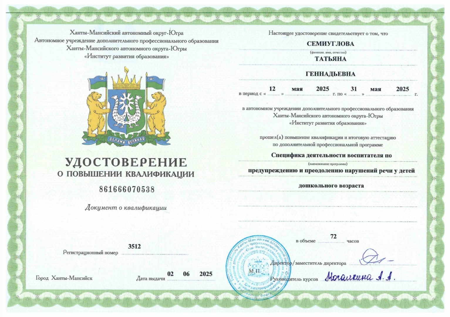 (ХМАО-Югра "Институт развития образования" . 72 часов. Форма обучения: дистанционная.).